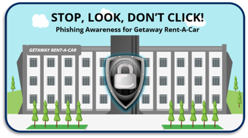 Getaway Rent-A-Car is a fictional nationwide rental company serving business and leisure travelers. With 308 employees across corporate and airport locations, the company experienced two phishing‑related data breaches in the past six months—one compromising vendor data, the other a fake password reset completed by 75% of recipients.